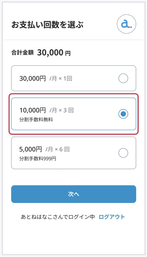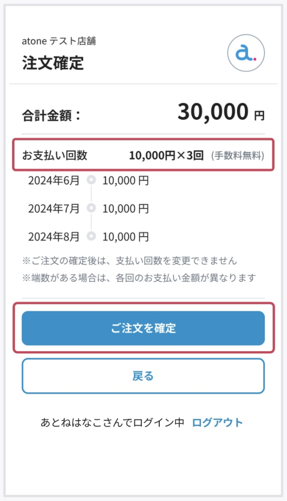 ※atoneアプリ専用カード・コード決済ご利用分は分割払いできません。